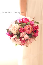 ピンクブーケですが中央が黄みがかった芍薬のつぼみや、葯や花糸が黄色のバラを入れて色を単調にならないよう工夫しています。